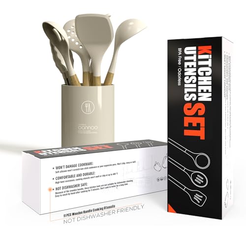 Silicone Cooking Utensils Set – 446°F Heat Resistant Silicone Kitchen Utensils for Cooking,Kitchen Utensil Spatula Set w Wooden Handles and Holder, BPA FREE Gadgets for Non-Stick Cookware (Khaki)