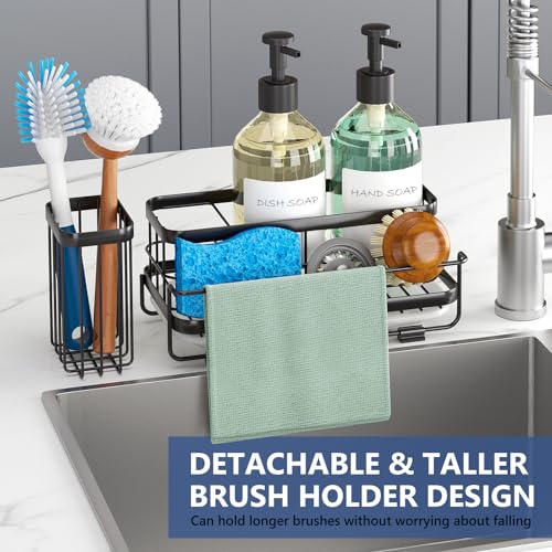 Trendy Sink Caddy Kitchen Sink Organizer, Sponge Holder for Kitchen Sink with Drain Tray, Rustproof Non-Slip Dish Soap Dispenser Rack Brush Holder, Sink Holder for Countertop Storage (Matte Black)