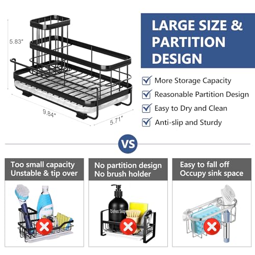 Specification: Trendy Sink Caddy Kitchen Sink Organizer, Sponge Holder for Kitchen Sink with Drain Tray, Rustproof Non-Slip Dish Soap Dispenser Rack Brush Holder, Sink Holder for Countertop Storage (Matte Black)